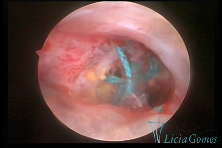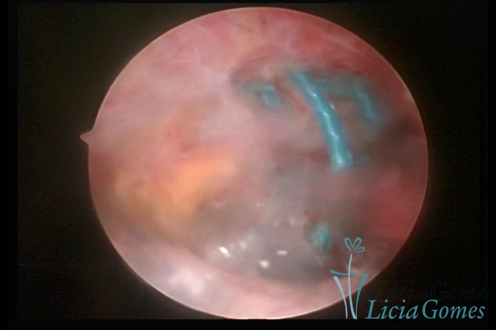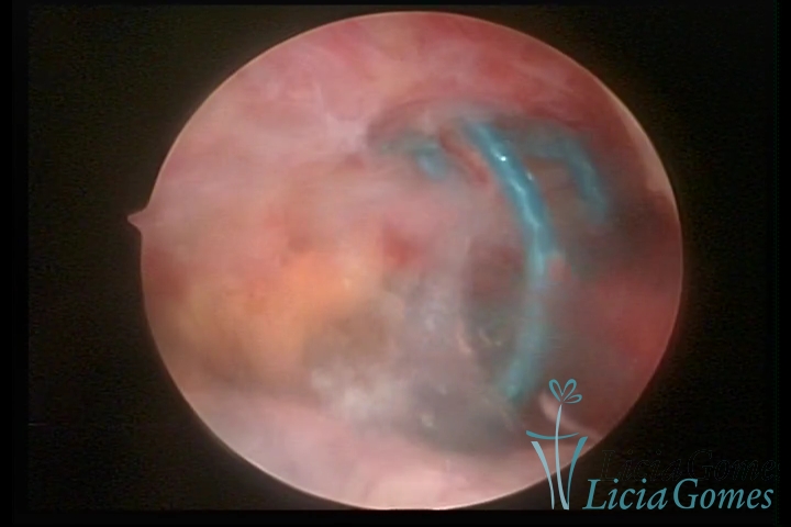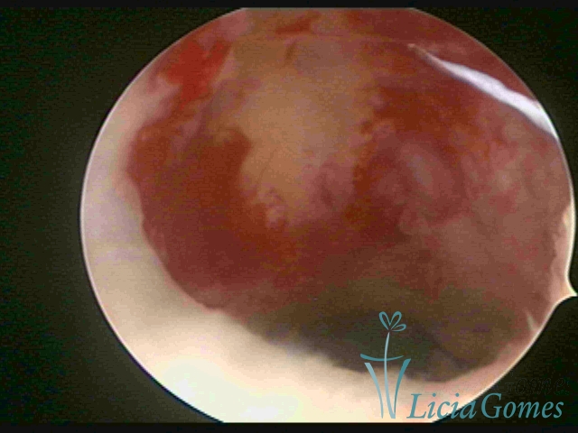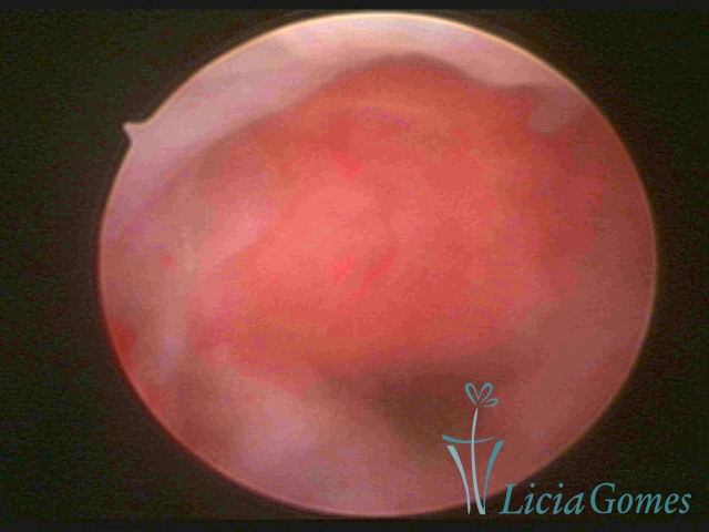 Retração da cicatriz de cesárea, reentrância com posterior abaulamento em região ístmica