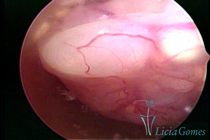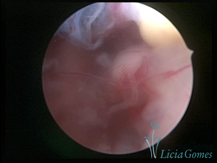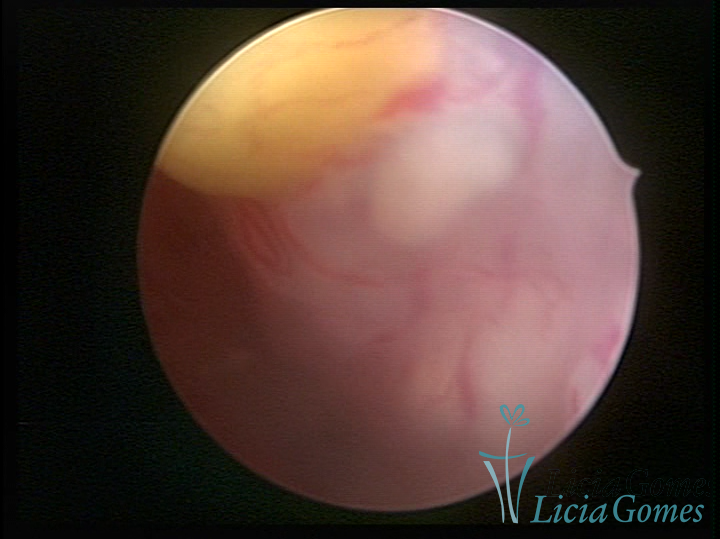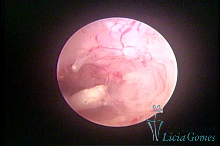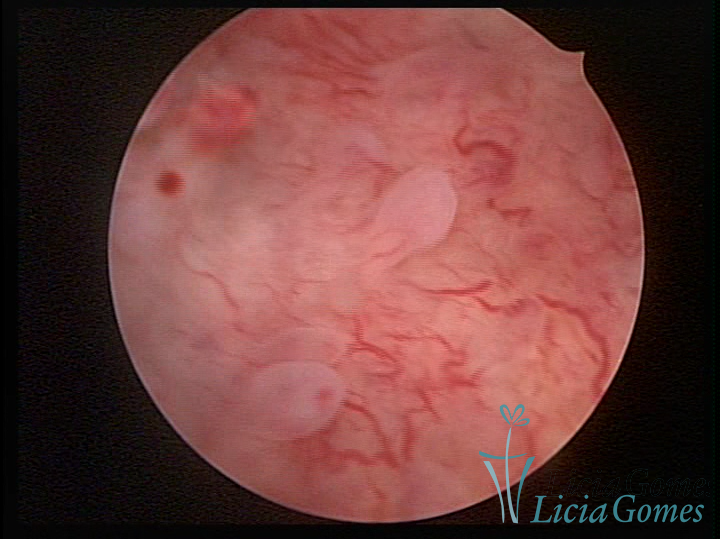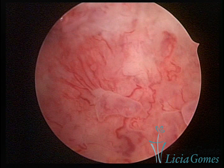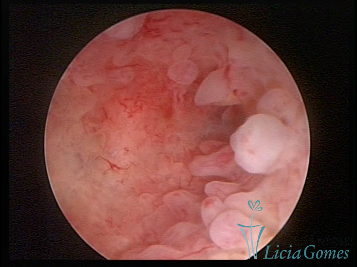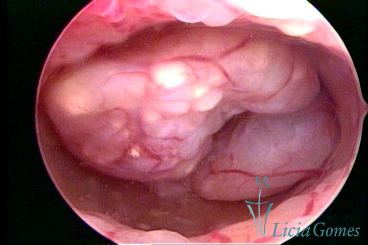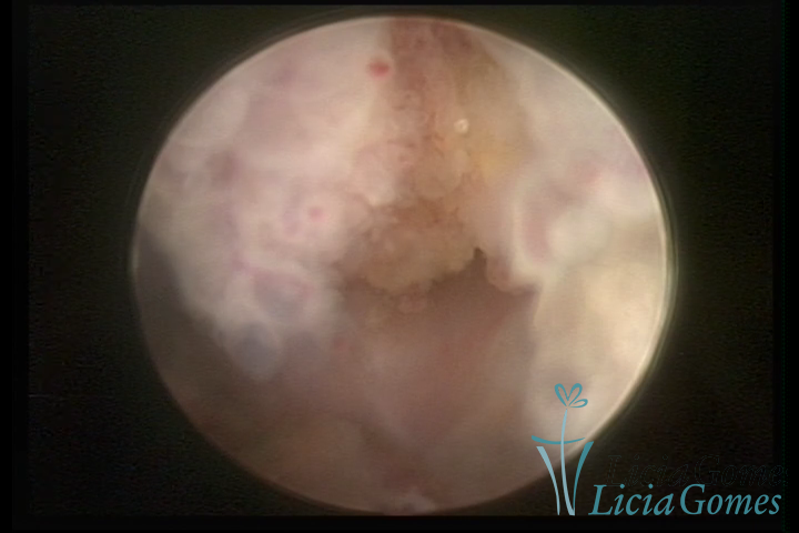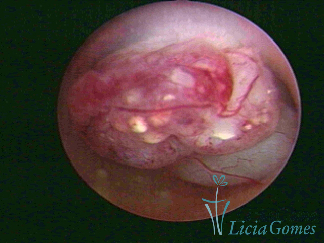 Este pode apresentar uma gama variável de aspectos macroscópicos, com aspecto pseudopolipoide; lembrando tecido cerebroide ou com reação deciduoide;a vascularização superficial é mais evidente e com vasos em formatos de saca-rolha ou espirais visualizando também a vascularização com atípias, com aumento do calibre dos vasos superficiais, pode ser encontrado também tecido em necrose, poderá haver um pequenos dendritos (papilomatoso).