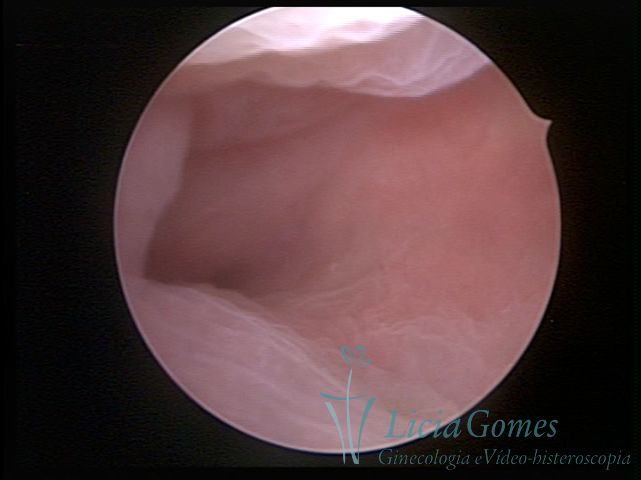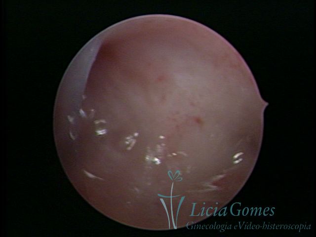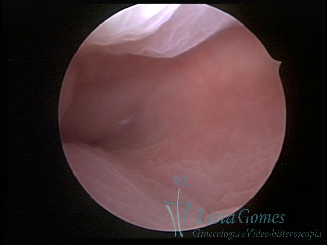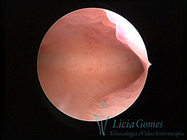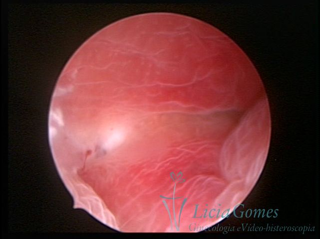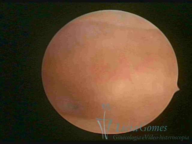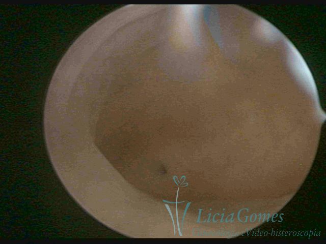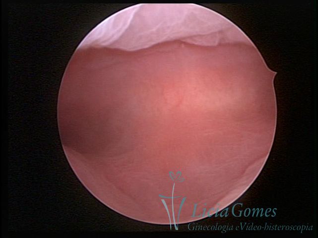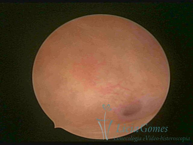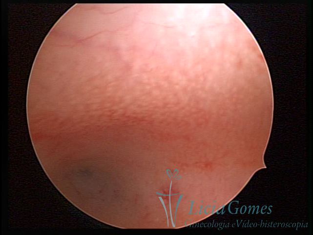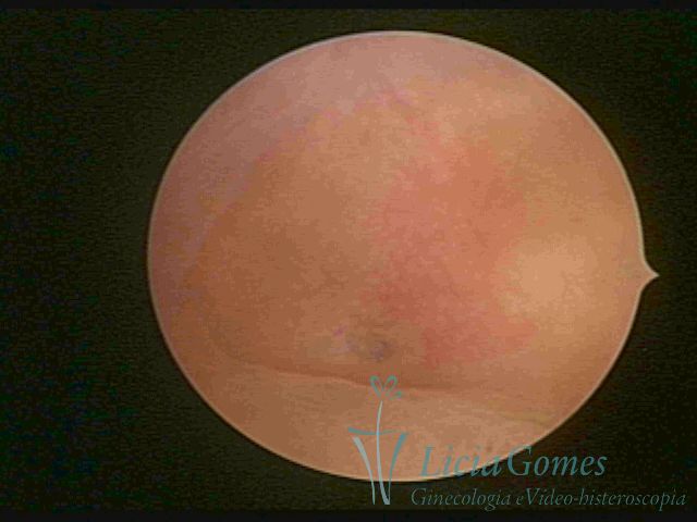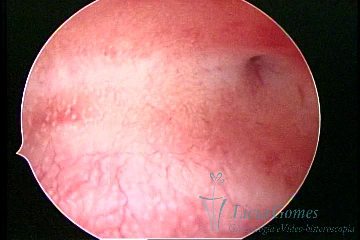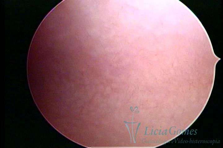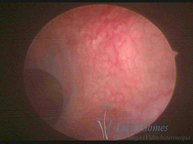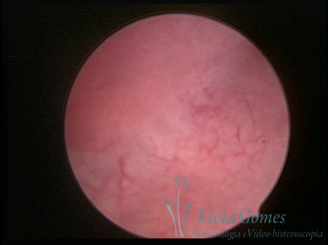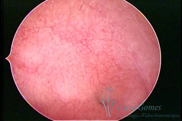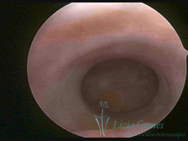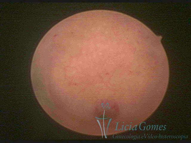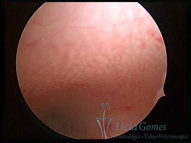 Days 16 to 18: Ovulation phase (initial secretory phase:) the uterine walls are more distended due to the relaxing action of progesterone, which provides a more enlarged aspect to the cavity structure. The endometrium is quite thick, presenting a red coloration and superficial drops which may vary from light swells to bossings separated by accommodation folds. The gland orifices are presented as pales spots with a thin surface and sparse and irregular distribution. The superficial vascularization outlines the capillary system which demarcates the tubal orifices. The tubal ostiums are thinner, more separated from the muscular cornual apex which provides a more shallow concavity. In the advanced secretory phase (days 20 to 25 of the cycle) the endometrium may reach 6-8mm. It acquires a stronger red coloration. The surface may present drops which resemble dunes, bossings, or polypoid and short digitations by stromal edema. The cornual regions are more shallow and the functional tubal ostiums are punctiform, delimited by a thin, shiny circular skin called pre-tubal diaphragm.