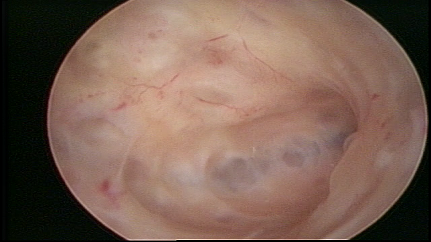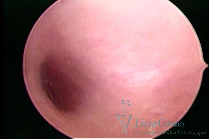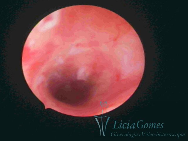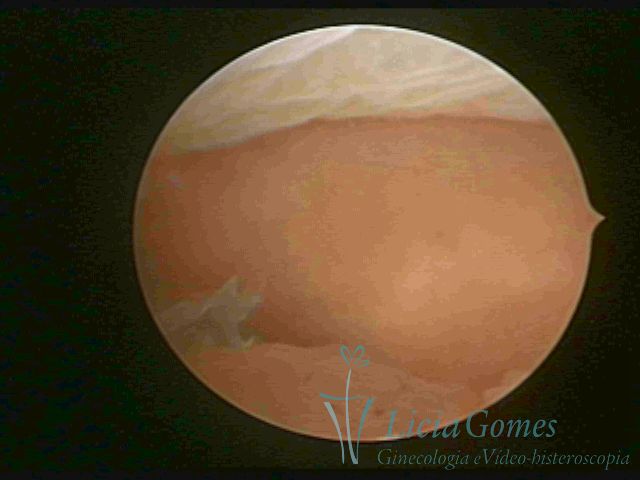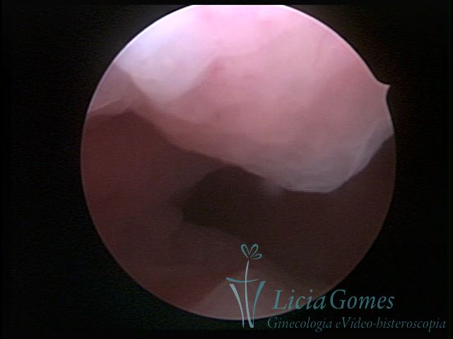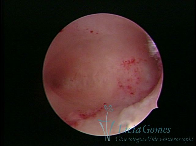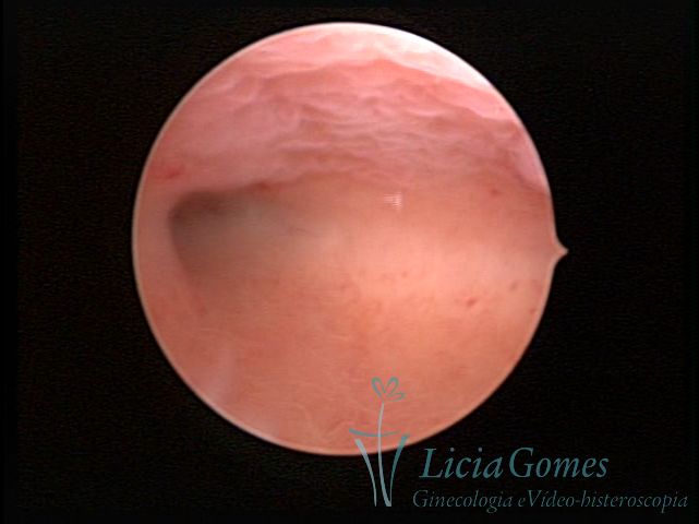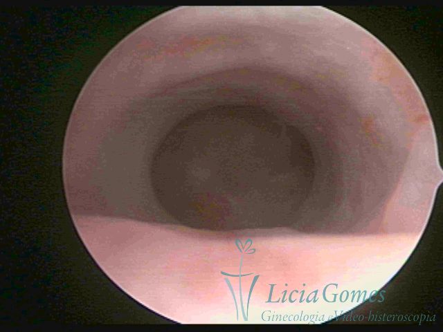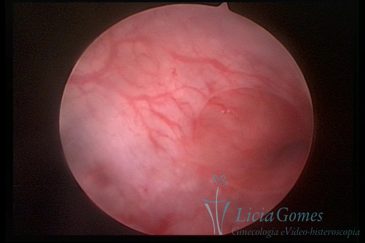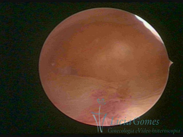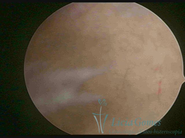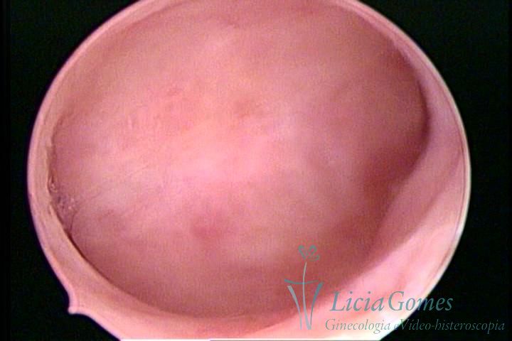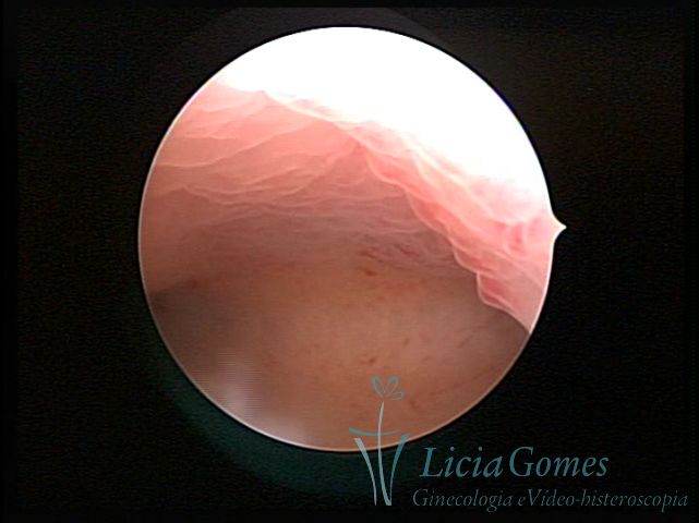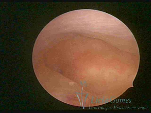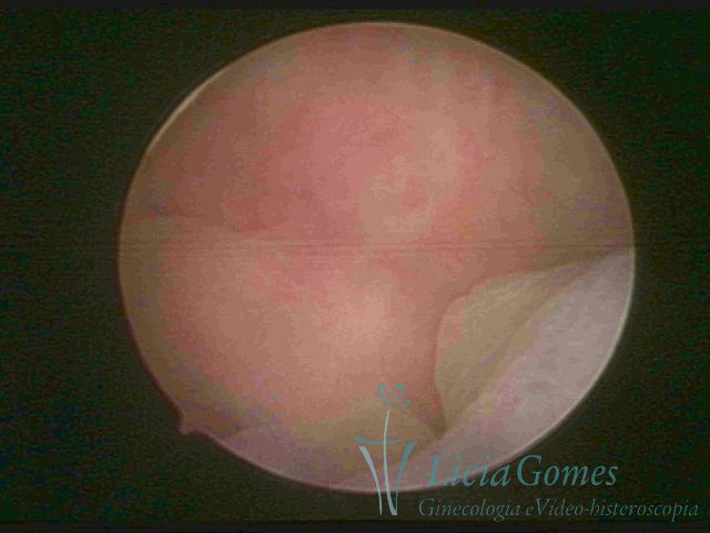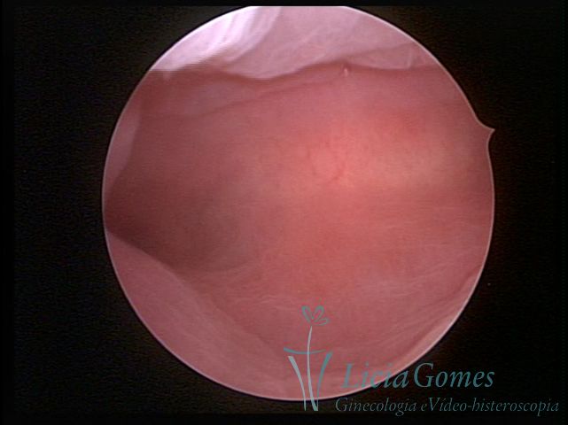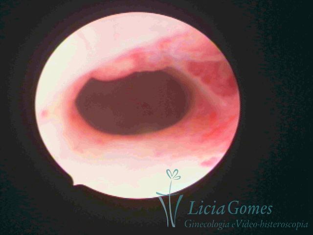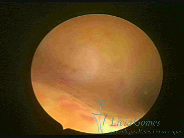 Days 16 to 18: Ovulation phase (initial secretory phase:) the uterine walls are more distended due to the relaxing action of progesterone, which provides a more enlarged aspect to the cavity structure. The endometrium is quite thick, presenting a red coloration and superficial drops which may vary from light swells to bossings separated by accommodation folds. The gland orifices are presented as pales spots with a thin surface and sparse and irregular distribution. The superficial vascularization outlines the capillary system which demarcates the tubal orifices. The tubal ostiums are thinner, more separated from the muscular cornual apex which provides a more shallow concavity. In the advanced secretory phase (days 20 to 25 of the cycle) the endometrium may reach 6-8mm. It acquires a stronger red coloration. The surface may present drops which resemble dunes, bossings, or polypoid and short digitations by stromal edema. The cornual regions are more shallow and the functional tubal ostiums are punctiform, delimited by a thin, shiny circular skin called pre-tubal diaphragm.