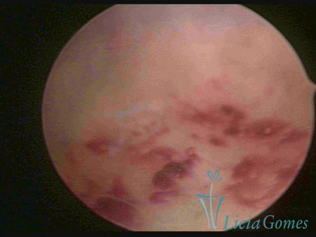 On Advanced chronic endometritis, a thin endometrium is observed, presenting denude, sometimes ulcered areas of a greenish gray color with micro varicosities presenting a hazel color, more accentuated in the cornual regions (vascular dystrophy.)