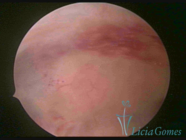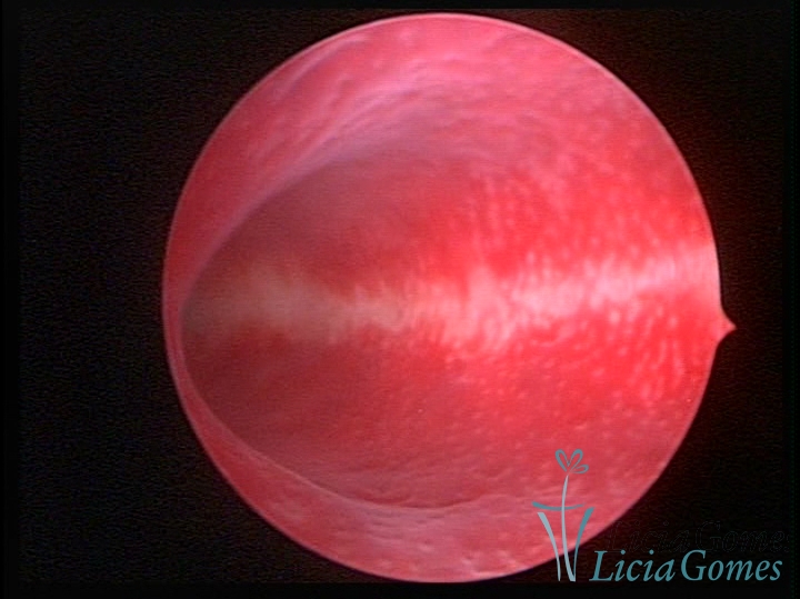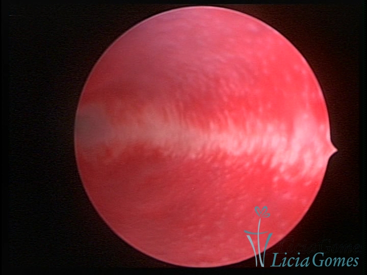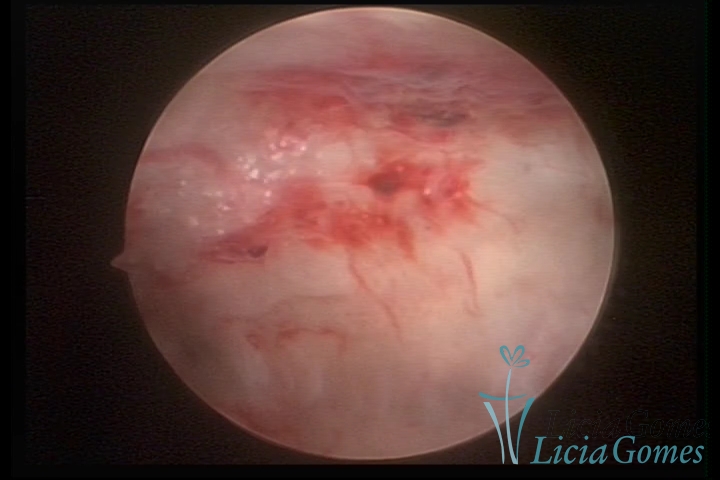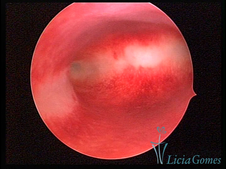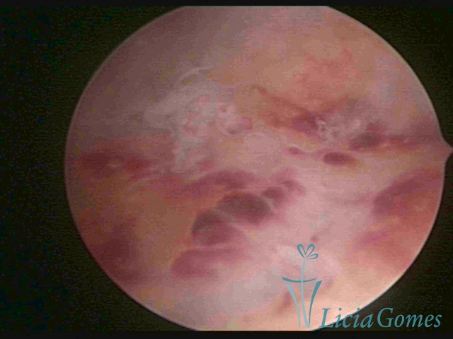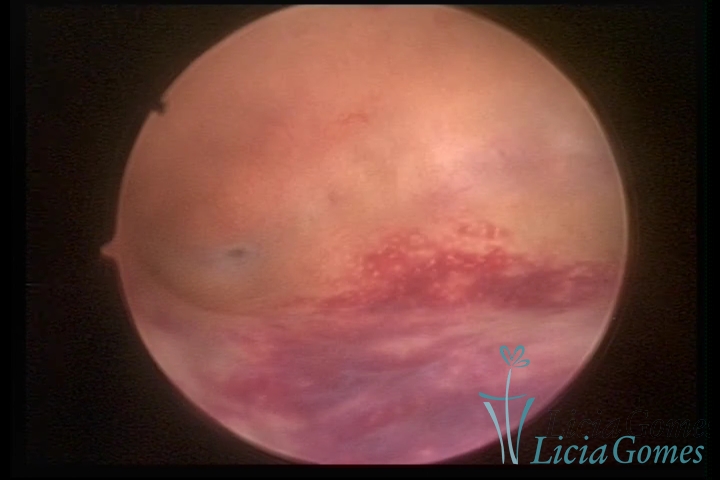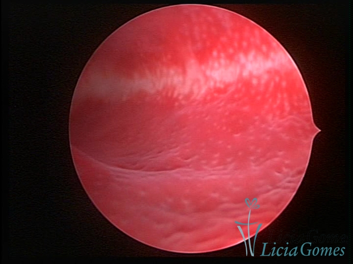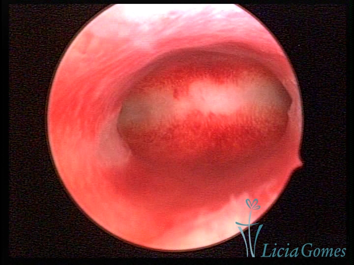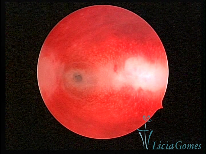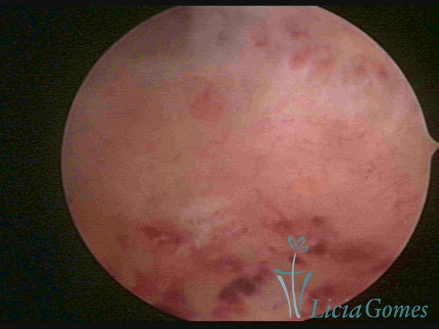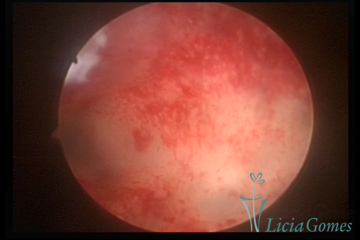 In video hysteroscopy, we observe the endometrium bleeding, its endometrial surface is speckled, presenting a “creamy” aspect and a whitish color with a brightness enhanced by the fibrin accumulated. Bluish or rough areas, which may correspond to cystic necrosis. The presence of adhering mucus or pyometra may occur.