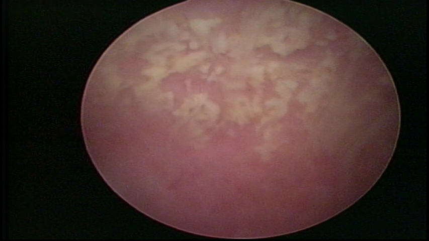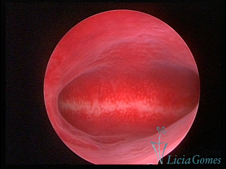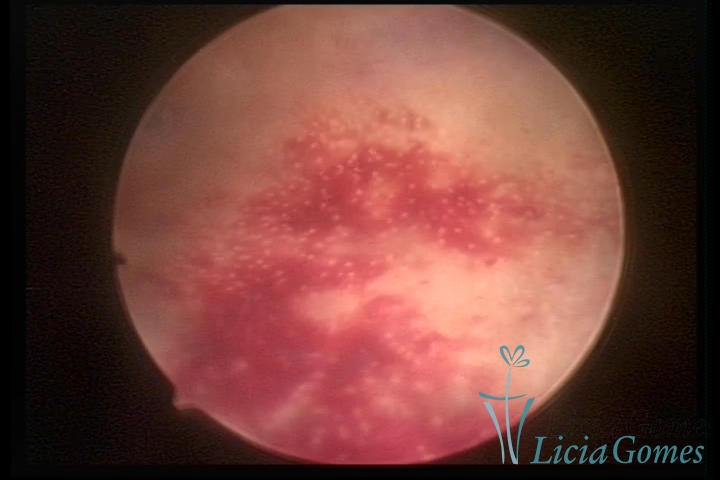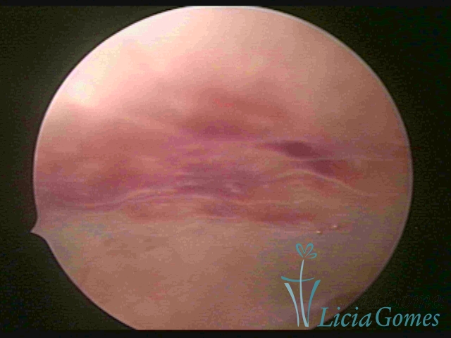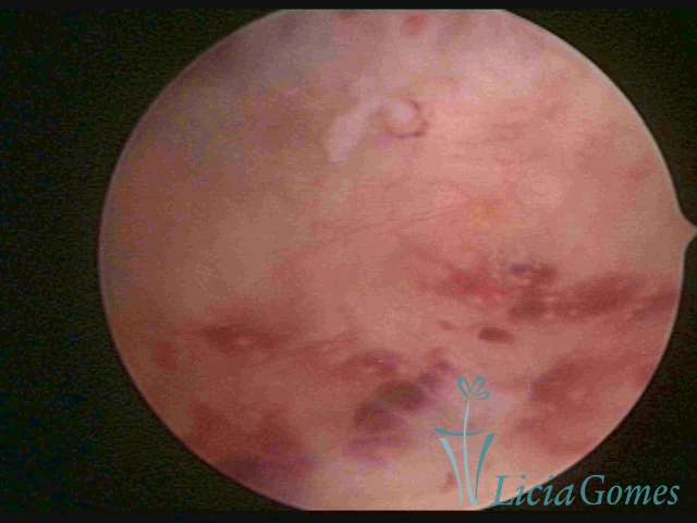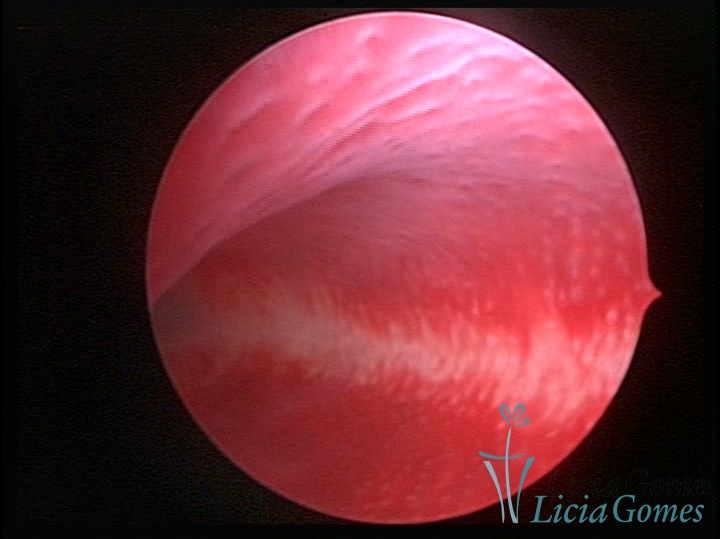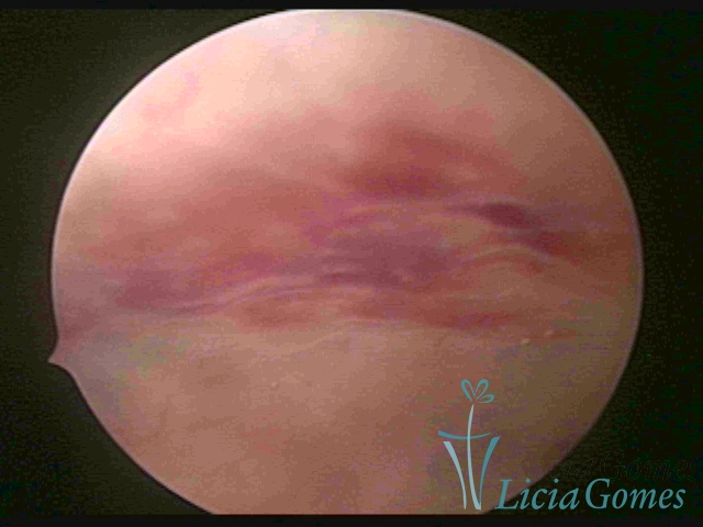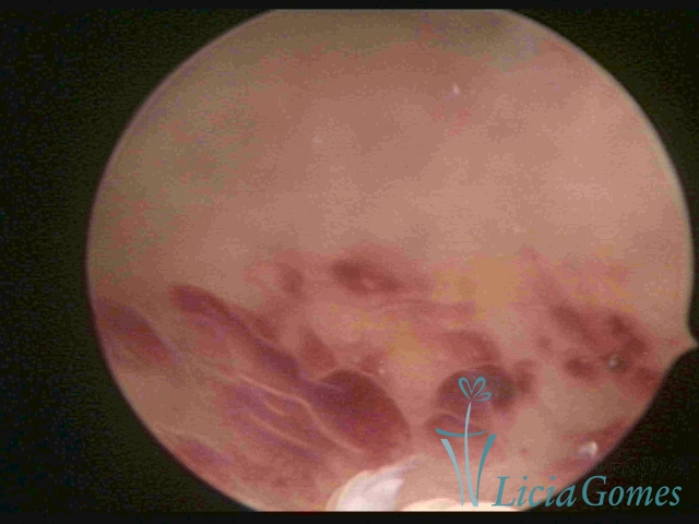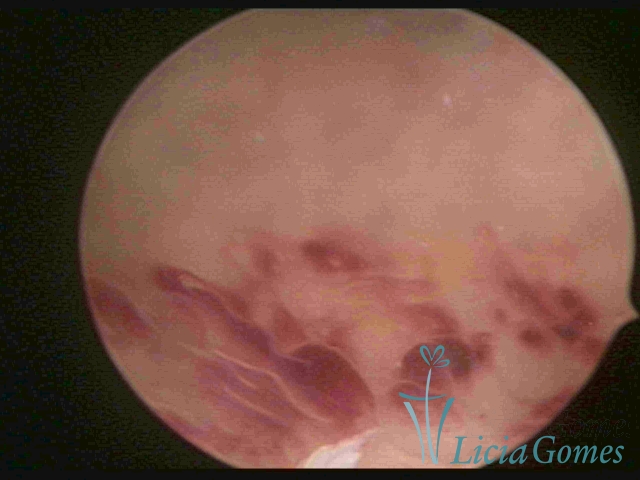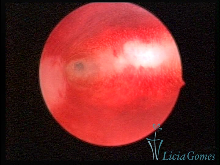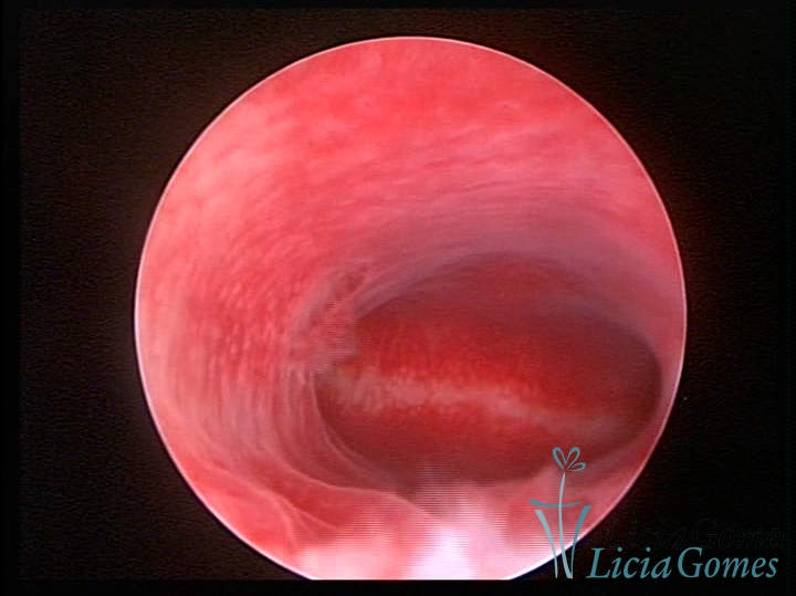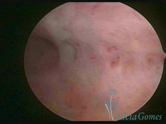 In video hysteroscopy, we observe the endometrium bleeding, its endometrial surface is speckled, presenting a “creamy” aspect and a whitish color with a brightness enhanced by the fibrin accumulated. Bluish or rough areas, which may correspond to cystic necrosis. The presence of adhering mucus or pyometra may occur.