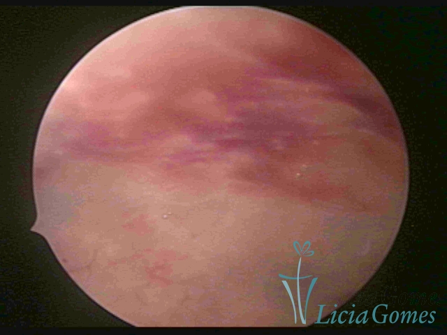 The surface of the endometrium may present changes such as a red punctuate forming vascular balls, a smooth, hypervascularized endometrium or intensely presenting red areas, with accurate edges and yellowish white spots in its interior, providing a "STRAWBERRY PEEL" aspect, a pale yellow color of fundic and lateral commissures, in contrast with the intense red color present in the walls.