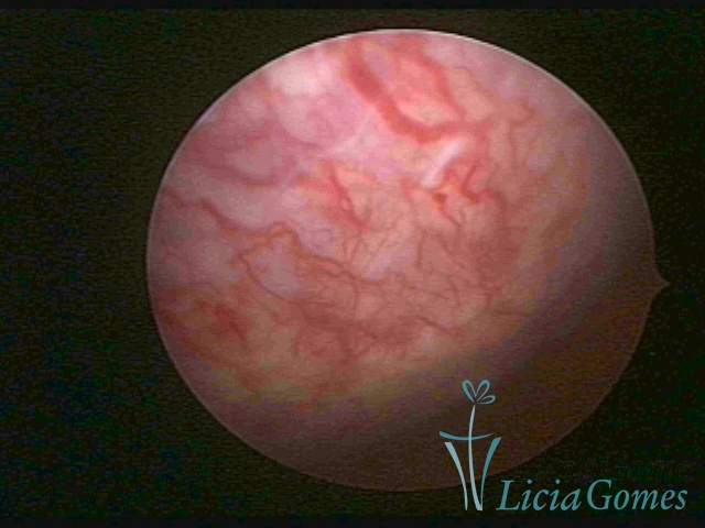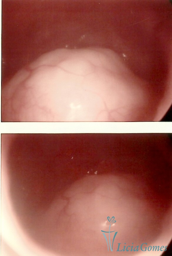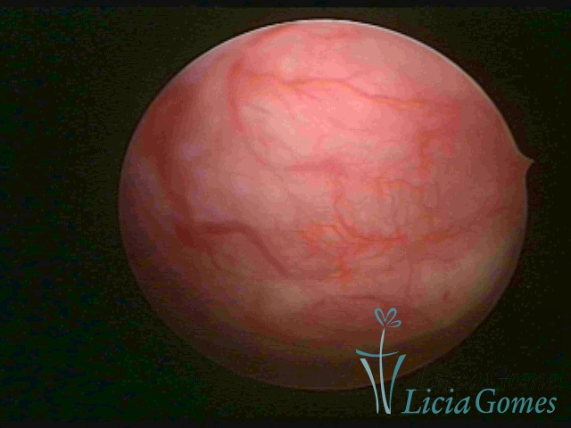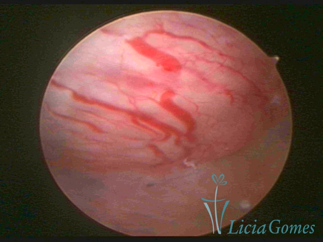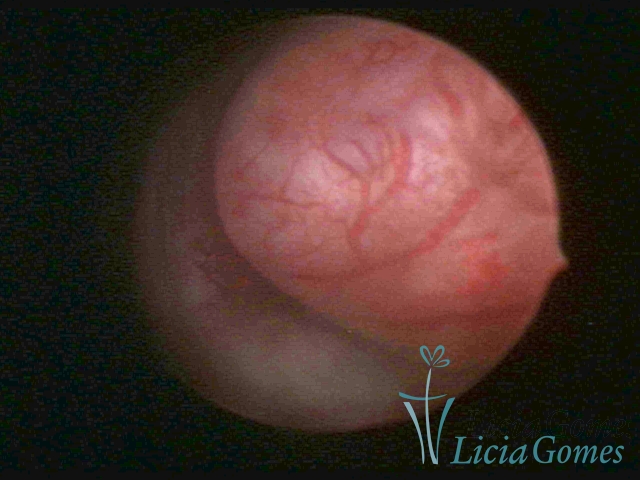 When the sessile myomas are round, smooth and red when stalked myomas become pale due to focal hypertrophy and present a translucent superficial vascularization.