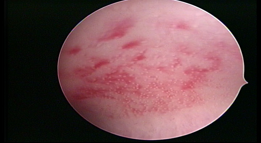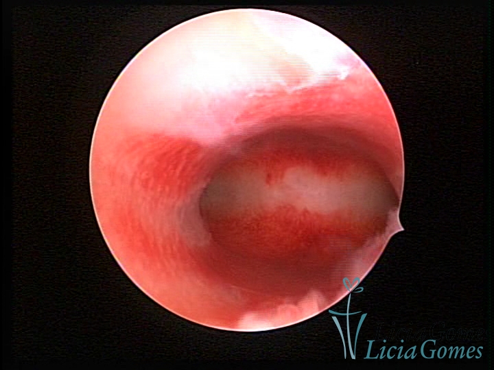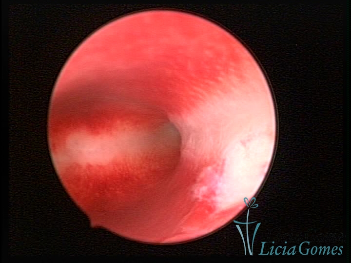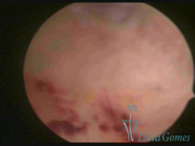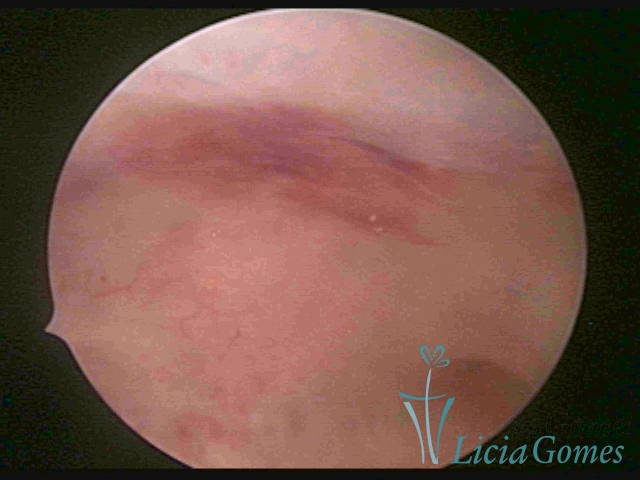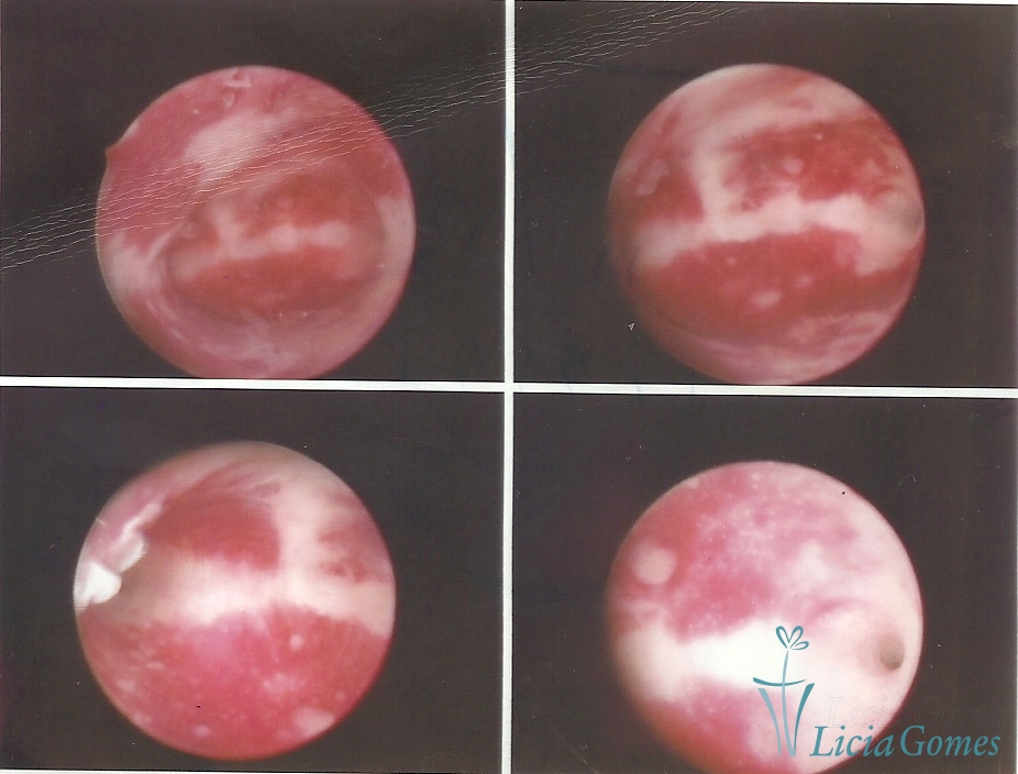 Já na Endometrite crônica avançada visualiza-se um endométrio delgado, com áreas desnudas, às vezes, ulcerada, com uma coloração cinza esverdeada com micro varizes, de coloração mais acastanhada, mais acentuada nas regiões cornuais (distrofia vascular).