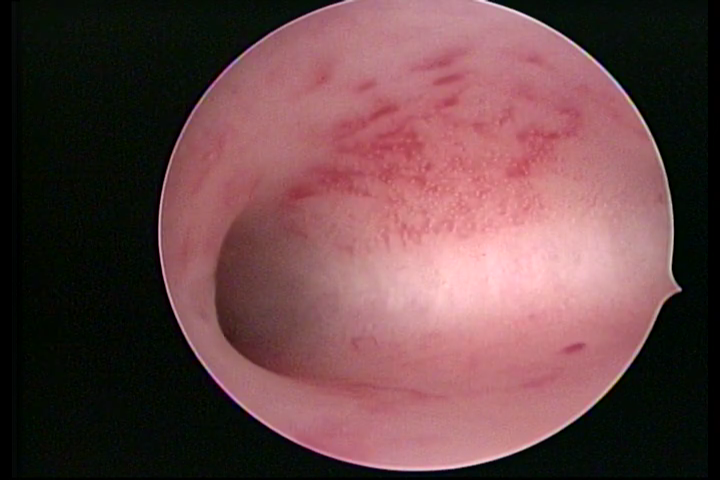 Na vídeo-histeroscopia observamos o endométrio sangrante, sua superfície endometrial é espiculada, com aspecto “cremoso” e coloração esbranquiçada com brilho acentuado pela fibrina acumulada. Áreas azuladas ou acidentadas que podem corresponder à necrose cística. Pode haver muco aderente ou piometra.
